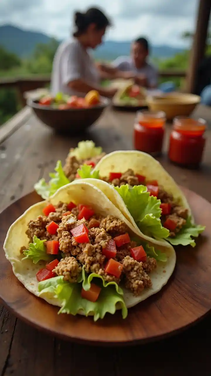 (((Soßenhuhn)) Zwei Tacos, das Rezept wird in einem Landhaus zubereitet, Sie können die Berge von Puerto Rico sehen, die Einwicklungen umfassen einheimisches Huhn, Tomatenwürfel und in Streifen geschnittenen Salat, die auf einer Holzplatte platziert werden, der Tisch aus dunklem Holz, der Tisch wird hochgebracht, und im Hintergrund sind Leute zu sehen, die rote Soße ist in das kleine Glas gelegt, teilen, mit Nahaufnahme fotografieren, 50 mm, nikon 35 mm (((Soßenhuhn)))