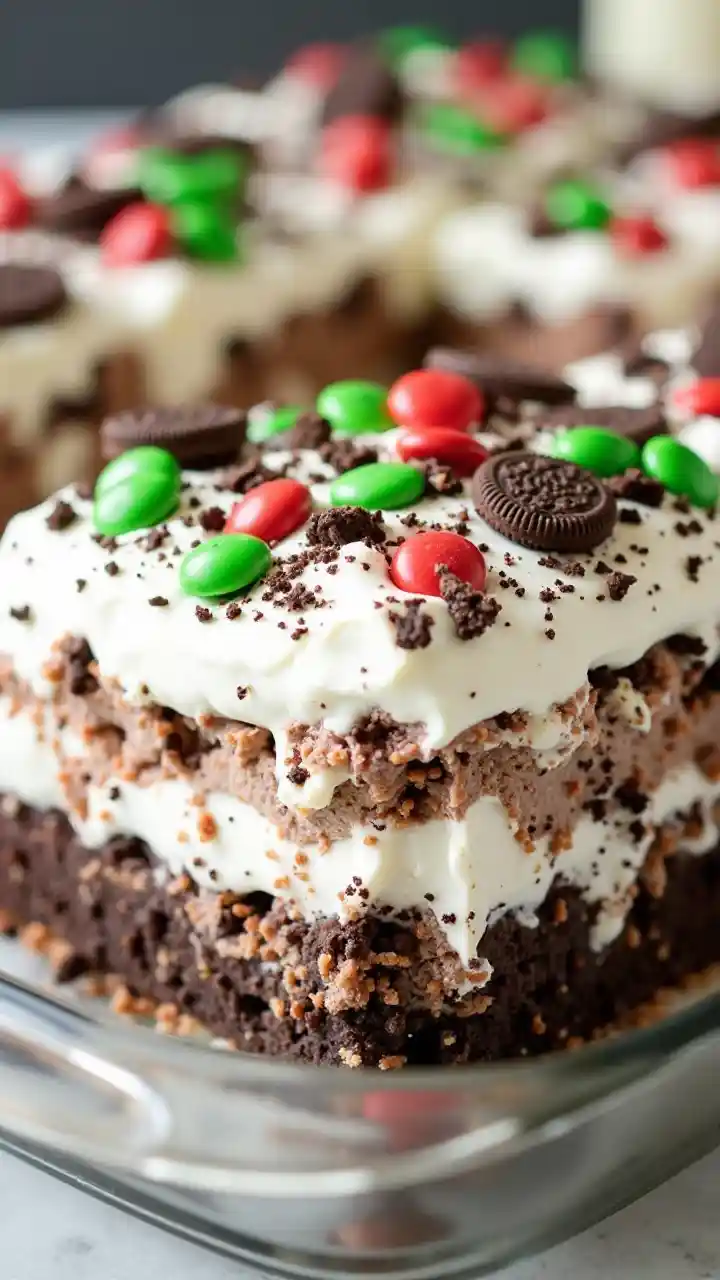 Nahaufnahme Sehen Sie sich die festlich gerösteten Oreo-Lasagne, Schichten von Oreo-Schokoladenschalen, eine cremeweiße Schicht, einen reichhaltigen Schokoladenpudding und flauschige Schlagsahne-Zutaten an. Die Desserts sind mit rot-grünen M & M geschmückt und mit zerkleinerten Oreos bestreut, wodurch ein lebendiger Look mit Urlaubsthemen entsteht. Die Schichten sind unverwechselbar, die Textur weich, cremig und der Belag bunt. Desserts werden in 9x13 Zoll großen Glasplatten serviert, sanftes natürliches Licht unterstreicht Textur und Farbe, im Hintergrund gibt es einen dezenten Bokeh-Effekt