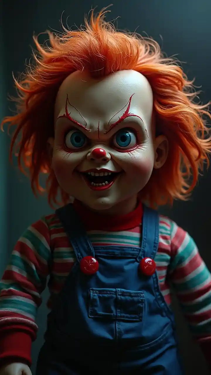 EleanorChuck Norris als böse Chucky-Puppe, magisches Lachen, Chucky Norris Helle und gesättigte Farben, hohe Detailgenauigkeit, klarer Fokus, dramatische Beleuchtung, Horrorfilm-Atmosphäre
