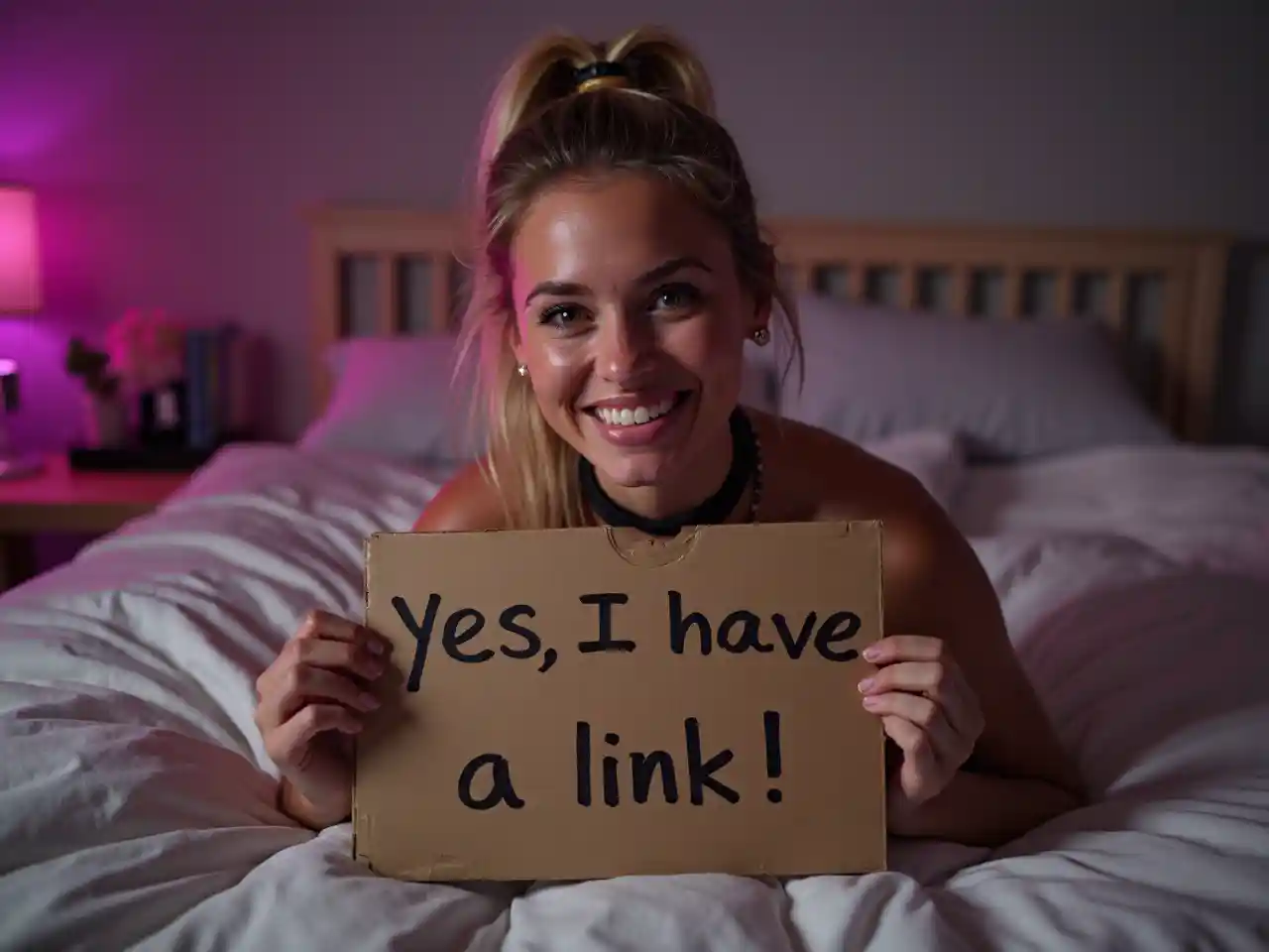 Ein Foto von Claire, perfekt symmetrisches Gesicht, Detailgesicht, Flickdetail, Ultra-Detail, Foto, (realistisch: 2.0), HDR, RAW, IMG _ 1018.CR2, ein 25-jähriges Mädchen sitzt drinnen. Bequemes Bett. Nachts. Sehr durchtrainierte Figur, Bauchmuskeln, schlanke Taille und breites Gesäß, schlanke lange Beine, ihre Oberschenkel sind muskulös und dick. Gefilmt mit der Handykamera. Die Kamera ist in guter Qualität und macht realistische Fotos. Das Licht ist ein warmes violettes Licht, das von bunten Lichtern auf dem Nachttisch stammt. Sie hat blasse Haut und große Brüste. Ihre blonden Haare hat sie zu Pferdeschwänzen gekämmt, die Wellen sind sanft und die Form perfekt. Ihr Gesichtsausdruck ist frivol, sie lächelt strahlend. Aidmafluxpro1.1, Handdetails, aidmaHyperrealism, strahlendes Lächeln. Sie lacht herzlich. Sie freut sich, lacht auf den Lippen. Die perfekte Hand, (schwarzer Lidschatten, blassroter Lippenstift), Rouge, ihr Gesicht ist voller Röte. ((Gesichtsfokus, Porträt)), Rebound-Beleuchtung, (Choker, Black-Choker), (Sie hielt ein Blatt mit der Aufschrift "Ja, ich habe einen Link!" Karton). Sie hält ein großes Pappschild mit der Aufschrift "Ja, ich habe den Link!!" mit einem Marker in der Hand,