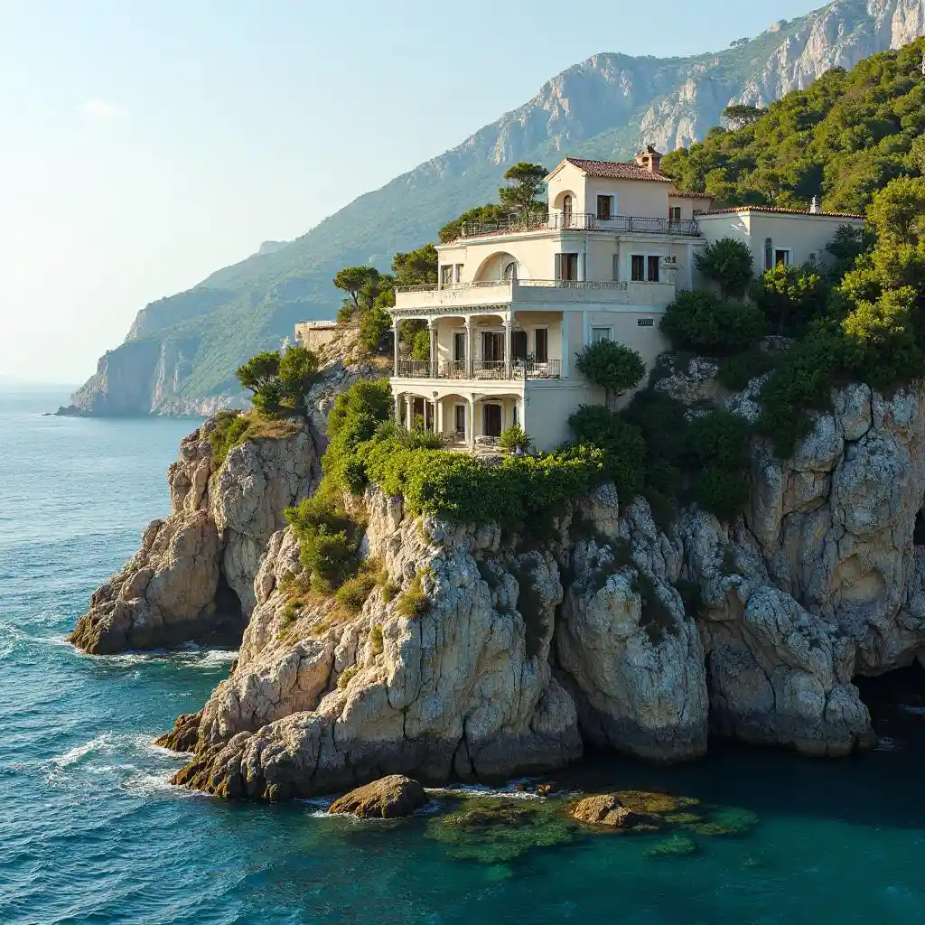 Die griechische Villa, verkleidet mit Efeu, besiedelt die Klippen der Insel.