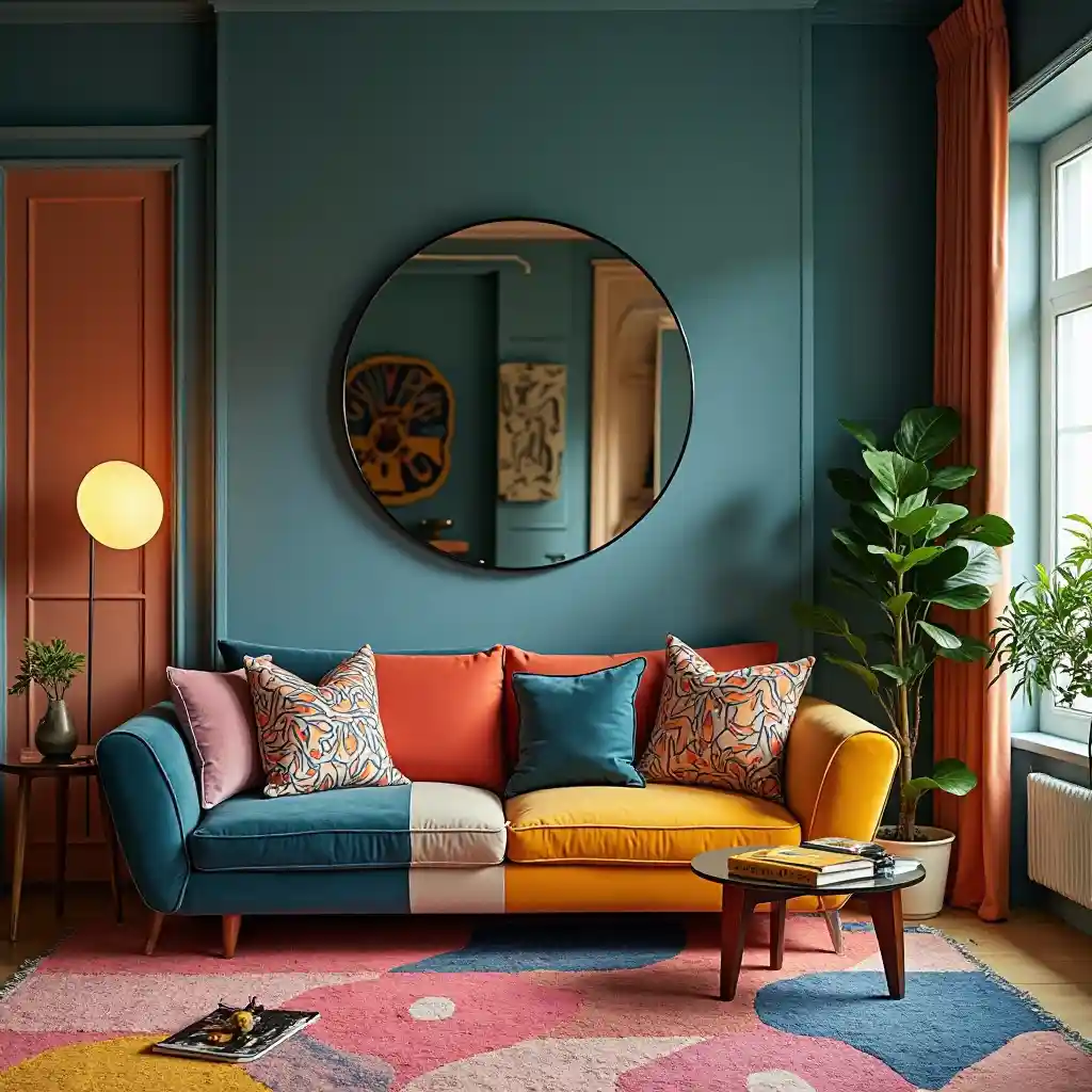 Buntes Wohnzimmer im kühnen neoklassizistischen Stil