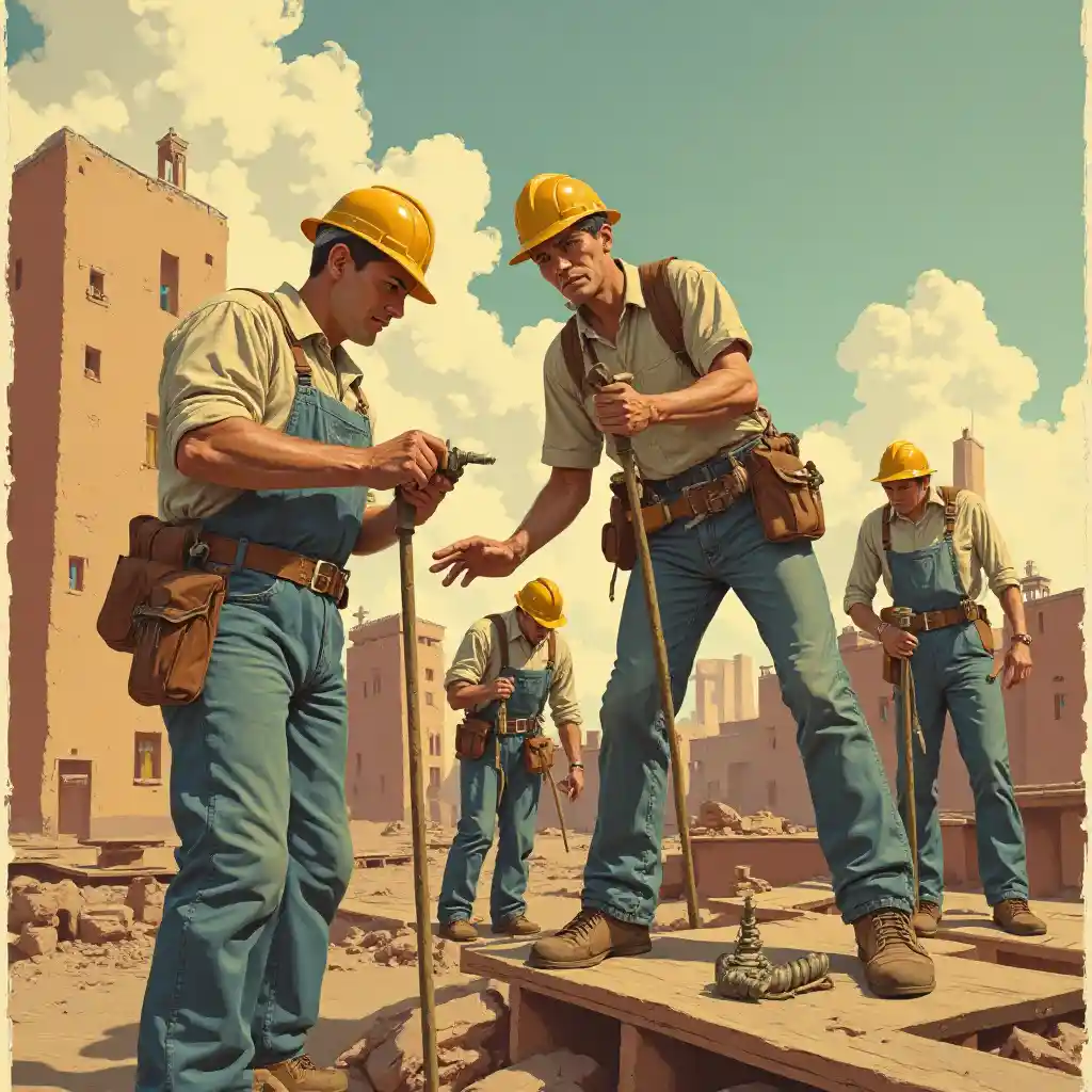 Poster zum Thema Architektur im sowjetischen Stil. Bauarbeiter/oder wenige Arbeiter bauen etwas mit Hand- oder Handwerkzeug