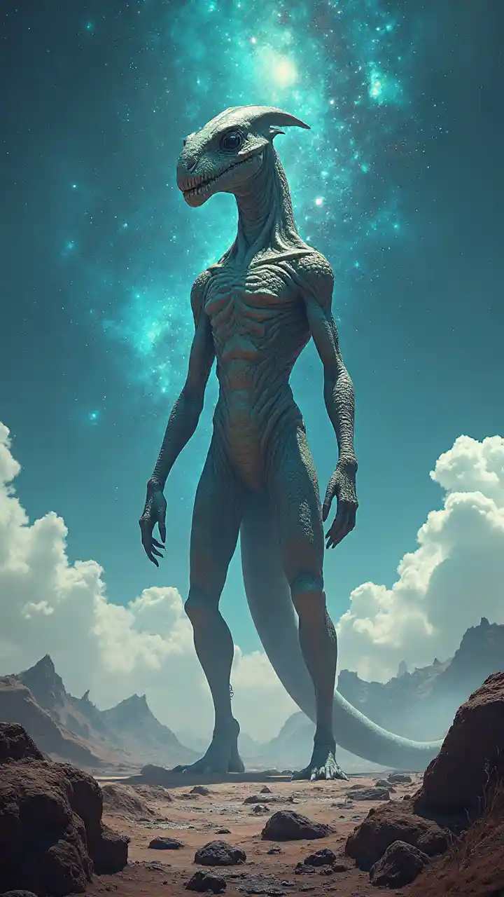 Außerirdische prähistorische Kreaturen, hoch aufragend, weltfremd, schimmernde Schuppen und ätherische Farben, stehen in einer nackten surrealen Landschaft, unter einem Himmel voller Wirbelgalaxien und seltsamen kosmischen Phänomenen, mit einem Seitenverhältnis von 9:16, um die ursprüngliche Natur der Transzendenz zu erfassen.