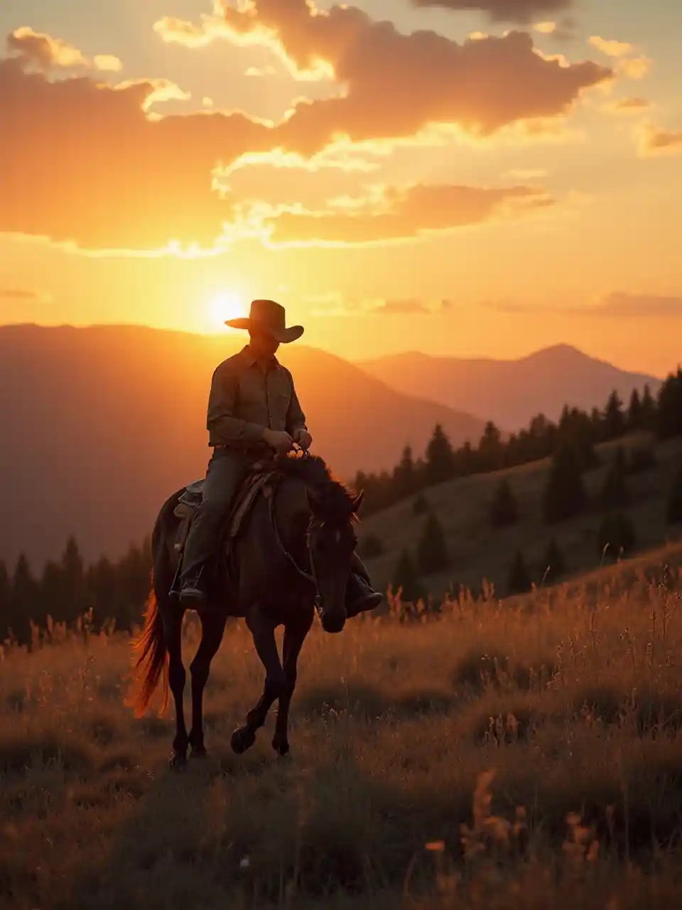 BraydenYoung Cowboys auf Pferden in der Ferne Berg-Sonnenuntergang