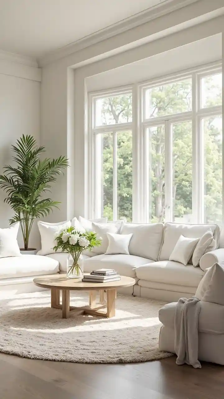 Helles und gemütliches Wohnzimmer, große Fenster und weiße Möbel