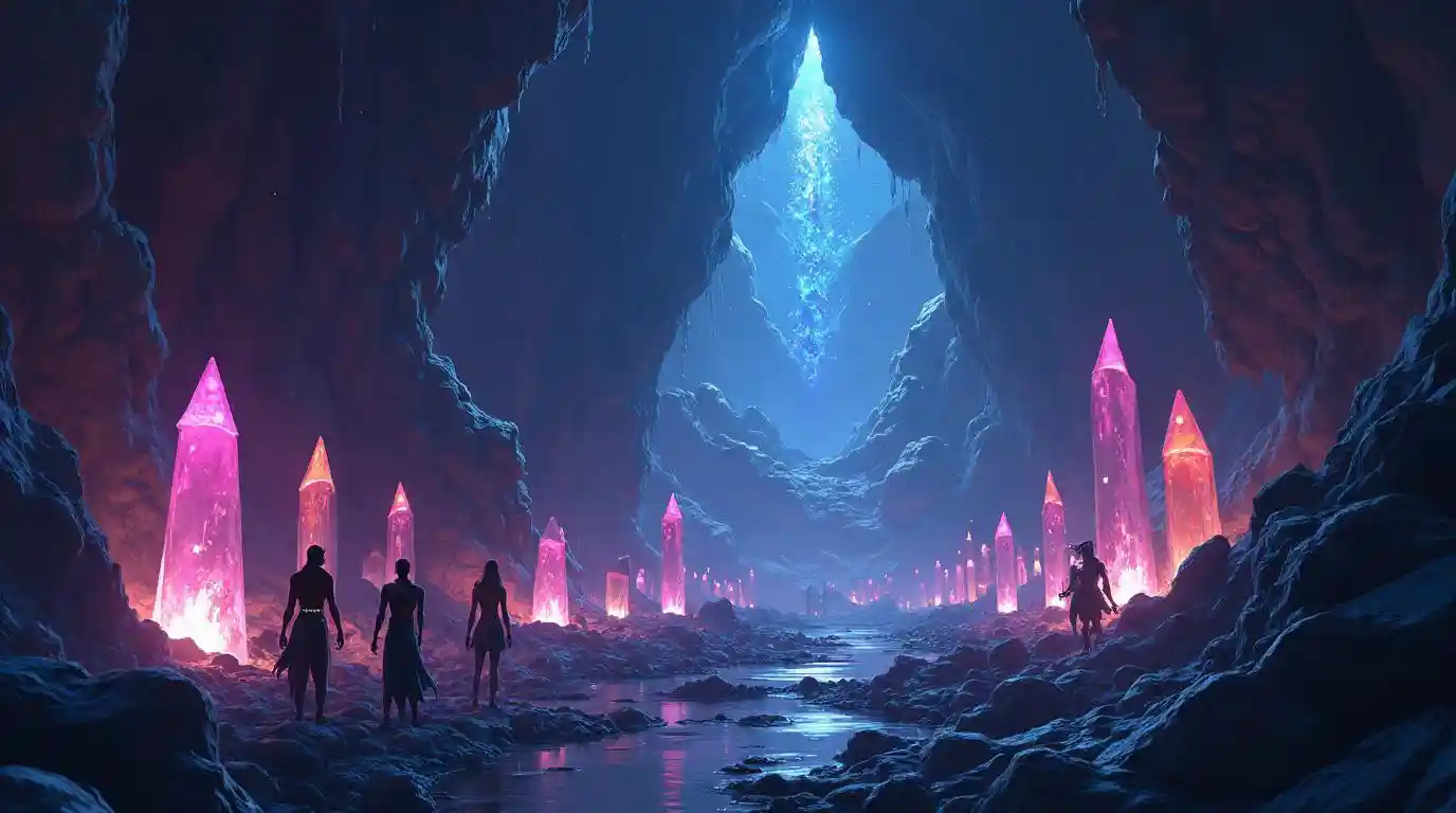 JocelynHöhlen leuchtende Kristalle der Stadt, Bewohner mit leuchtenden Tattoos, Passagen dunkle Fantasie Anime Vision.