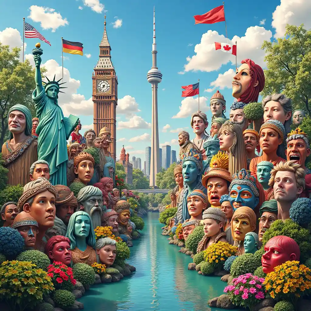 Eine lebendige und komplizierte Szene entfaltet sich und zeigt eine atemberaubende Collage kultureller Idole und Symbole aus aller Welt. Die hoch aufragenden Figuren, darunter detaillierte Darstellungen der Freiheitsstatue und verschiedener kultureller Masken, bilden zusammen mit berühmten Wahrzeichen wie Big Ben und dem Canadian National TV Tower eine auffällige Landschaft, die auf eine Feier des globalen Erbes hindeutet. Flaggen aus Deutschland, den USA, Kanada und Italien wehen in der Luft, üppiges Grün und ein friedlicher Fluss verweben sich vor Ort und spiegeln die harmonische Mischung aus Natur, Geisteswissenschaften und Kunst wider. Die farbenfrohe Komposition ist voller vielfältiger Gesichter und Skulpturen, die jeweils eine einzigartige Geschichte ausstrahlen und die Essenz von Multikulturalismus und Einheit in einem visuell auffälligen Bild verschmelzen. Insgesamt vermittelt das Bild ein starkes Gefühl der Verbindung zwischen den Ländern und lädt das Publikum ein, die Schönheit der kulturellen Vielfalt zu schätzen.
