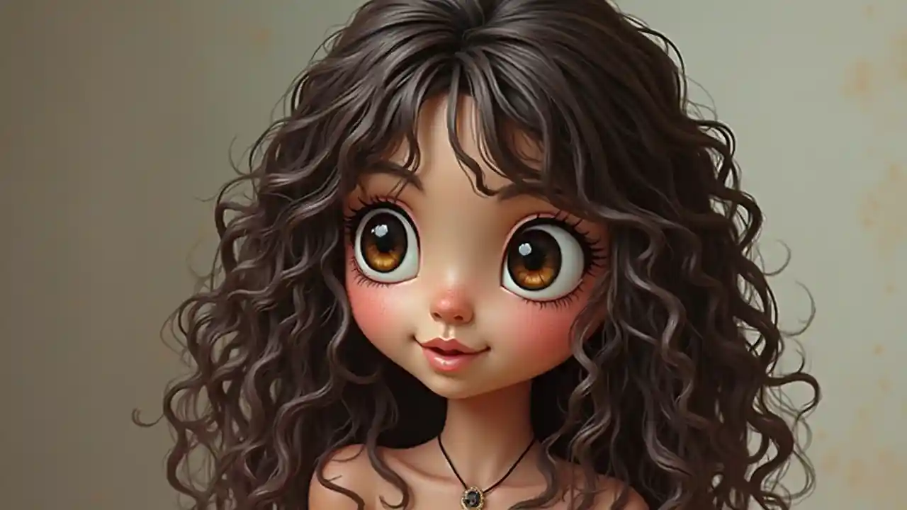 Ein kleines Mädchen mit langen Locken, großen Augen, kleiner Nase, kleinem Mund