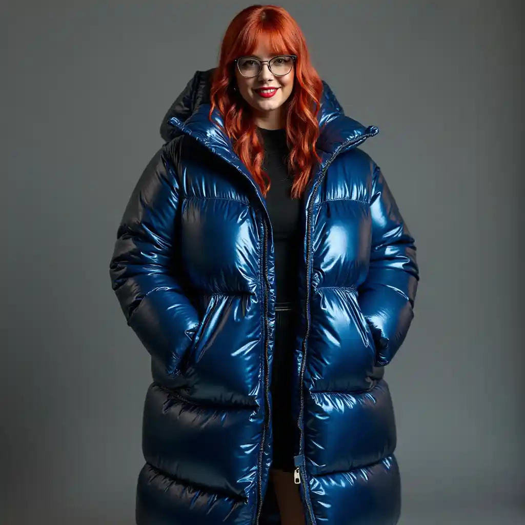 Bild in voller Länge 35-jährige sexy kurvige weibliche Dame mit Brille lächelnd dunkelroter Lippenstift und Nasennagel, Schultern lang rot gewelltes, lockiges Wetlook Pony Schwanzhaar und massive Puffa-Jacke in großer Größe mit nördlicher Gesichter Überblast Überblaster Überblaster Bodenlänge Überblaster Größe Wetlook glänzender Spiegel Metall glänzender metallischer Glanz pvc irisierter Metall glänzender Metall dunkle Farbe wetlook glänzender Chrom tiefe Königsblauer Oversize Puffa Sperrige Overfilled Jacke und trägt Stiefeletten und glänzende schwarze Wetlook PVC Glanzblaue Lederleggings Dazu ein glänzendes schwarzes Lederkleid mit schwarzem Satin-Shirt