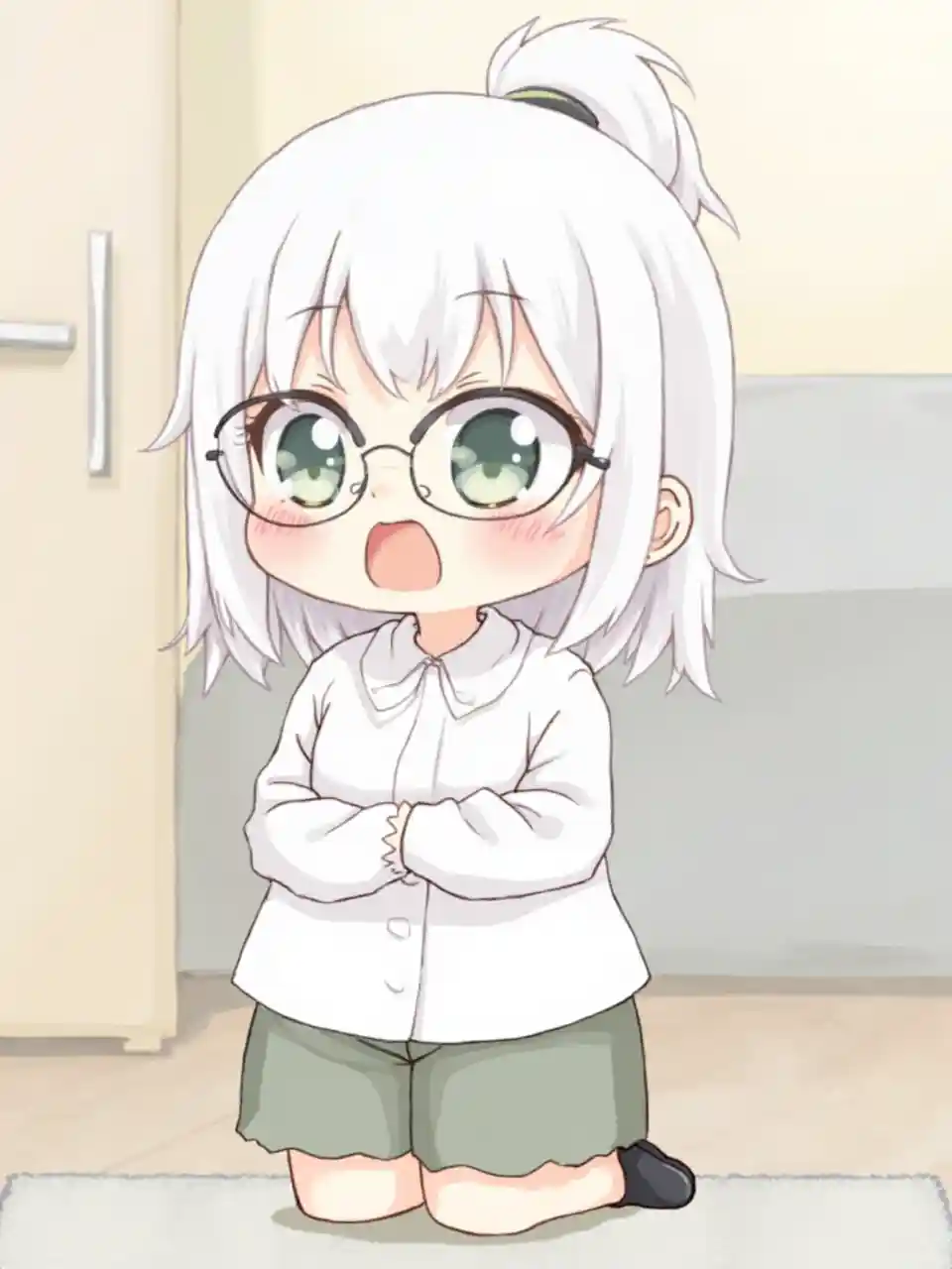 1girl, (süßes Mädchen), (dunkelgrüne Augen), (weißes Haar), (glattes Haar), (kurzer Pony), (kurze Pony), (glatte Haut), (schwarze Rundbrille: 1,2), (nur mit weißem Hemd), Rouge, (glitzernde Augen), sehr hübsches Mädchen, sehr süßes Gesicht, (mittlere Brust), (ein bisschen Panik, Augen halb geöffnet)), (süße Lippen), (krummer Kopf)), (Hund, Knien auf dem Boden), (im Schlafzimmer), (einfacher Hintergrund), (ganzer Körper), solo, (Chibi), (Chibi), Chibi Style, Flachfarben-Stil, handgemalt _ Style, hohe Qualität, hohe Details, hohe Qualität, kühne Linien