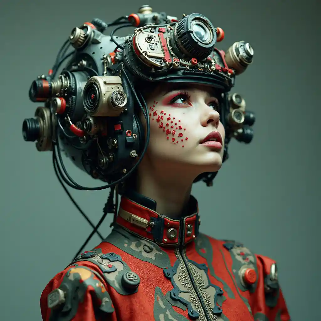 Futuristisches Mädchen im Cyberpunk-Universum. Tragen Sie Kleidung, die traditionelle bestickte Kleidung mit mechanischen Teilen kombiniert, und tragen Sie einen komplexen Kopfschmuck auf dem Kopf, der alte elektronische Produkte mit Science-Fiction-Maschinen kombiniert. Die Installation wurde mit Drähten, Zifferblättern, Kameraobjektiven und Retro-Panels aufwendig gefertigt. Das mit rot-weißen geometrischen Mustern bemalte Gesicht blickt in dramatischer Pose nach oben. Konvergenz von Haute Couture und Netzwerktechnik. Ultra-High-Definition, dramatische Beleuchtung, Studiohintergrund.