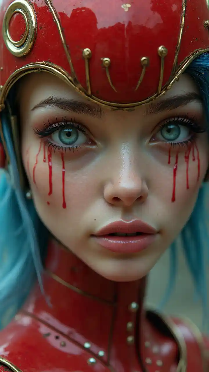 **Feature Eine Roboterfrau in einer detailroten Metallscheibe mit goldenem Rand und übergroßen glänzenden Augen. Der surreale Kontrast zwischen realistischer Haut, komplexen mechanischen Texturen und verspielten Plastikaugen wird betont. Pastelles Licht, kinoähnliche Lichtschärfe, Science-Fiction-Atmosphäre, blaue Haare, die durch den Helm schauen. Surreale, skurrile und doch bewegende Porträts.