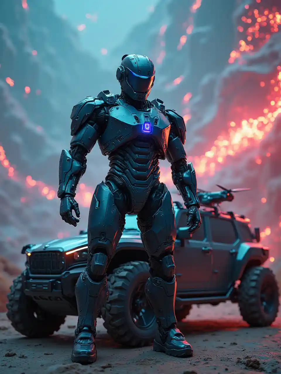 Ein majestätischer, voll bewaffneter Militär-Elektroniker positioniert sich selbstbewusst vor die Kamera, und sein fortschrittliches Head-up-Display blinkt synchron mit einem lebendigen holografischen Laserlicht. Im Hintergrund wird eine surreale und ätherische Landschaft von einem komplizierten Whirlpool-Muster mit exquisitem Licht und lebendigem rotem Glitzer beleuchtet, das eine mysteriöse und weltfremde Atmosphäre verleiht. Der Roboter steht stolz vor einem stilvollen, futuristisch gepanzerten Sportwagen, ausgestattet mit robusten SUV-Rädern und robusten verstärkten Metallteilen, und auf dem Dach befestigt ist eine sichere Luftdrohne, die Spitzentechnologie und fortschrittliche militärische Kraft ausstrahlt.
