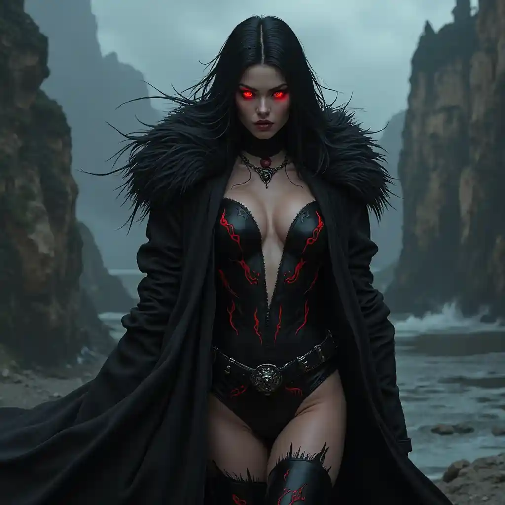 Stephen gammell, eine auffällige Fantasy-Frau mit langen dunklen Haaren, leuchtenden roten Augen und waghalsigen roten Lippen, steht selbstbewusst vor der dunklen, dramatischen Landschaft. Bekleidet war sie mit einem freizügigen, schwarzen Outfit, das mit roten Mustern verziert war, ergänzt durch einen langen schwarzen Mantel mit Fellkanten. Die ominöse Kulisse, geprägt von rauen Klippen und launischem Himmel, verstärkt die erbitterte Präsenz der Figur.