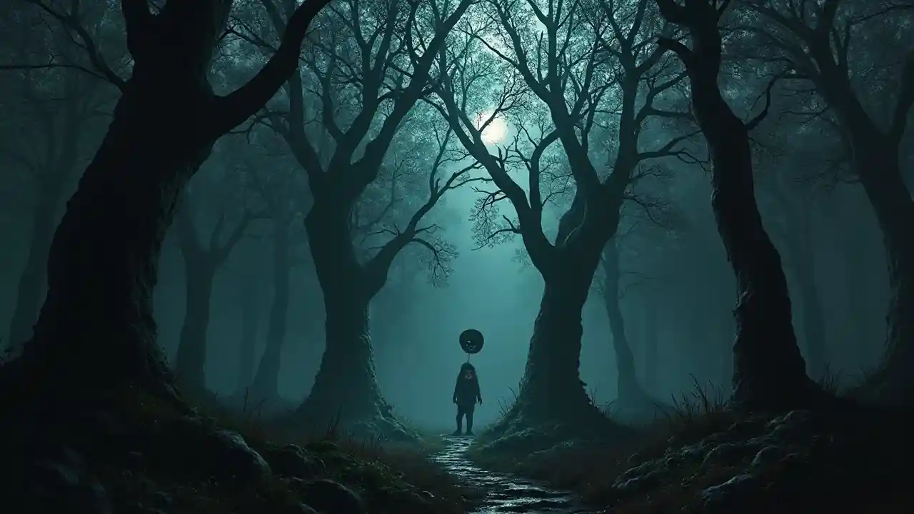 Gruselige Bäume mit Licht und Gesichtern im dunklen Wald