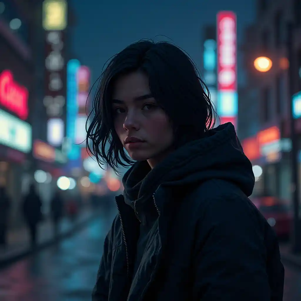RoyDer dunkelhaarige Junge im Kapuzenpullover in der Nachtstadt, Cyberpunk, realistisch, 8k-Auflösung