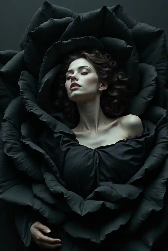 VictoriaDer Todesengel, eine eindringlich schöne Frau, rollt sich in einem riesigen schwarzen Rosenblatt zusammen. Ihr Gesicht fehlt - stattdessen ein blasses, ausdrucksloses s