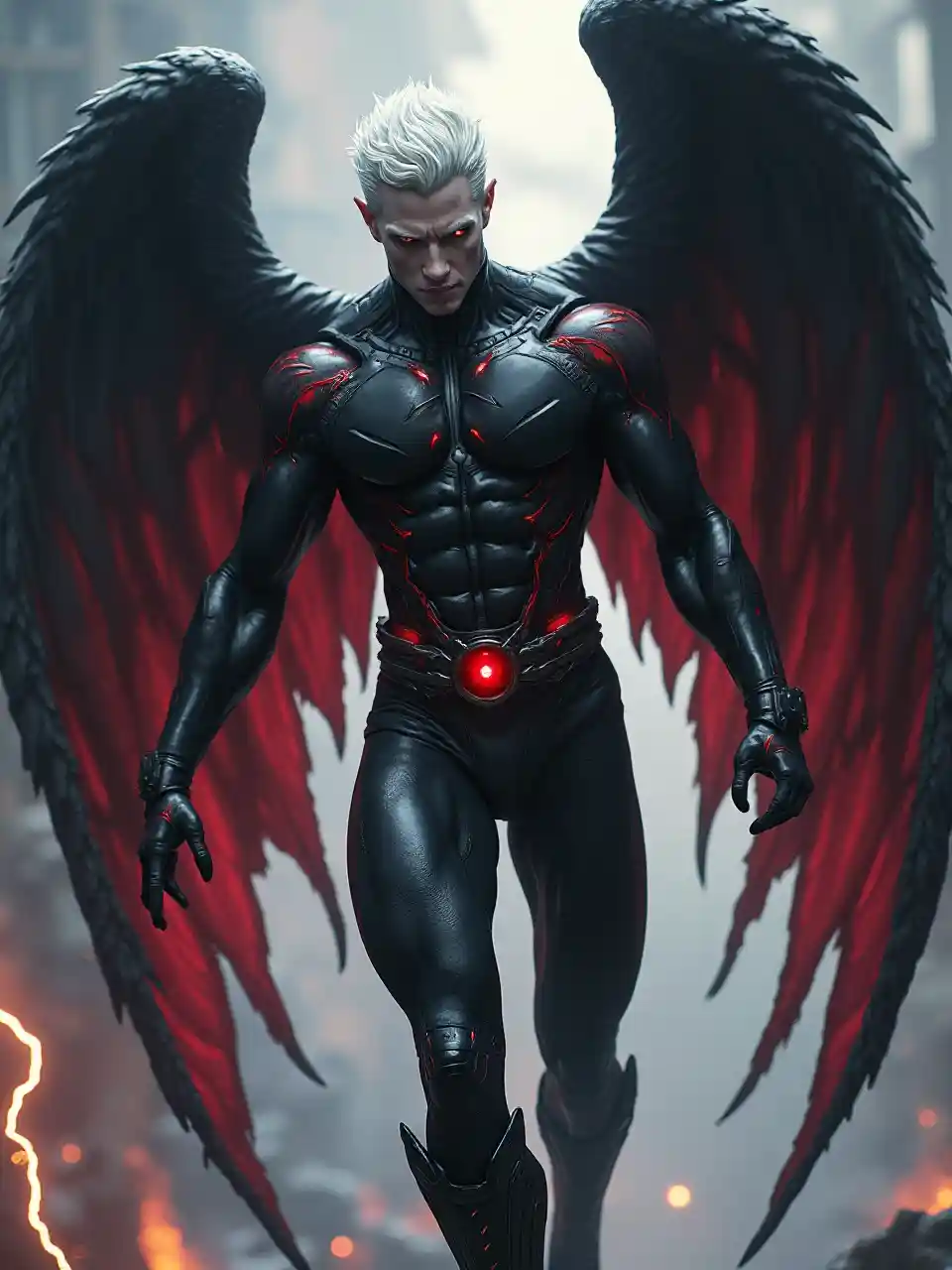 Supermännliche Männchen, junge Kaukasische Männer. Todesengel und Zukunftstechnologien. Sehr groß (6 ft 8), muskulös, stark, stark, olympische Figur, Gewichtheber. Die Brust ist breit, die Taille schmal und die Beine kräftig. Blasse, kreideweiße Haut, keine Farbe. Ein kurzes weißes Haar verblasste in den spitzen Spitzen, das obere Haar stellte sich auf. Dicke Augenbrauen und kräftige Zähne, dichte weiße Augenbrauen, leuchtende rote Augen. Starke Blicke, Drohungen. Ein weißes Soul-Pflaster im Gesicht. Form fitting komplett schwarze Bodyhose mit dunkelrotem Muster auf Brust, Armen und Beinen. Die Strumpfhose besteht aus glänzendem Latexmaterial und deckt den ganzen Körper ab. Gürtel ist eine Zukunftstechnologie mit leuchtendem rotem Licht in der Mitte/am Knopf. Schwarze Latexhandschuhe, schwarze, kniehohe Latexstiefel mit dunkelrotem Muster. Engelsflügel, überwiegend schwarz, mit dunkelroten Hochglanzfedern. Flügel und Gefieder sind metallic-schwarz und rot. Ganzkörper-Pose, durch Blitze fliegen.