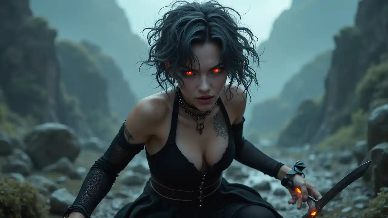 (Meisterwerke, beste Qualität, Absurdität, Highres), erstaunliche Qualität, sehr ästhetische, volumetrische Beleuchtung, digitaler Kunststil, Malästhetik, konzeptionelle Malerei, Ultra HD, solo, 1girl, Oberkörper, zufällige Haltung. Zufälliger Winkel, dynamische Haltung, dynamischer Winkel Fee, mittelkohlgraues Haar, aufgerollter Unterschnitt, feuerrote orange Augen, schräge Augen, schwarzes Netzoberteil mit Lederkorsett, nebliger Bergtempel, wütendes Gebrüll, Schattendolch in der Hand, geduckte Jägerposition, leuchtendes Runentatoo über das Schlüsselbein, Kettenohrring mit kleinem Knochen