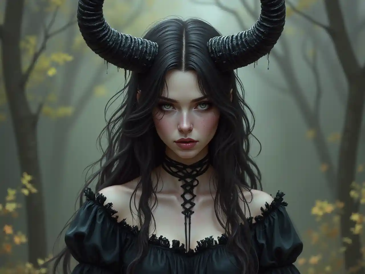 Eine Frau mit langen Hörnern, schwarzem Gürtelkleid auf dem Kopf, schwarzem Gürtelkleid auf den Schultern, Porträts von Figuren, Gotik, Dirk Krabbes, Fantasy-Style, Dämonenkönigin