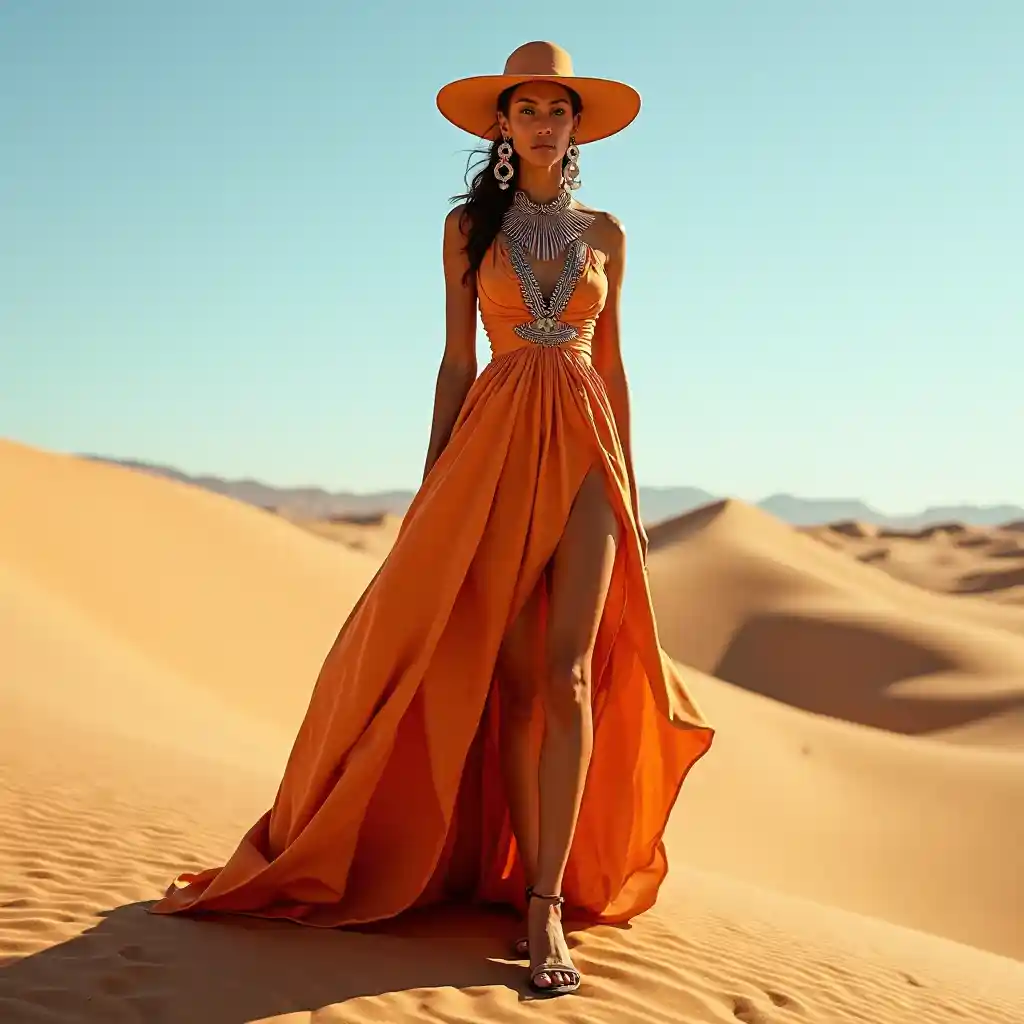 Entwerfen Sie ein gewagtes, avantgardistisches Modekleid mit dem Thema Wüste. Das Kleid sollte eine dramatische, skulpturale Kontur aus leichten, fließenden Stoffen haben, die die Farben der Wüstenlandschaft imitieren – warmer Ocker, tiefe Terrakotta und weicher Sand. Dieses Kleid zeichnet sich durch asymmetrische Schichten aus, die auf einer Seite zu einem langen Zug gestapelt sind, der wie eine Wüstendune fließt. Der Ausschnitt ist hoch und strukturiert, der Ausschnitt ist aus zarten Metallakzenten gefertigt und ähnelt den Motiven der alten Wüstenkunst. Das Kleid wird mit einem überdimensionalen Persönlichkeits-Ohrring, einer breiten Kantenmütze und Gladiator-Sandalen kombiniert. Bei den Dreharbeiten spielen die Szenen in einer riesigen Wüste mit goldenen Dünen und strahlend blauem Himmel. Das Licht sollte die goldene Zeit sein, warmes und leuchtendes Licht auf das Modell werfen, sie steht hoch und strahlt Kraft und Eleganz vor dem Hintergrund der weiten und trockenen Landschaft aus.
