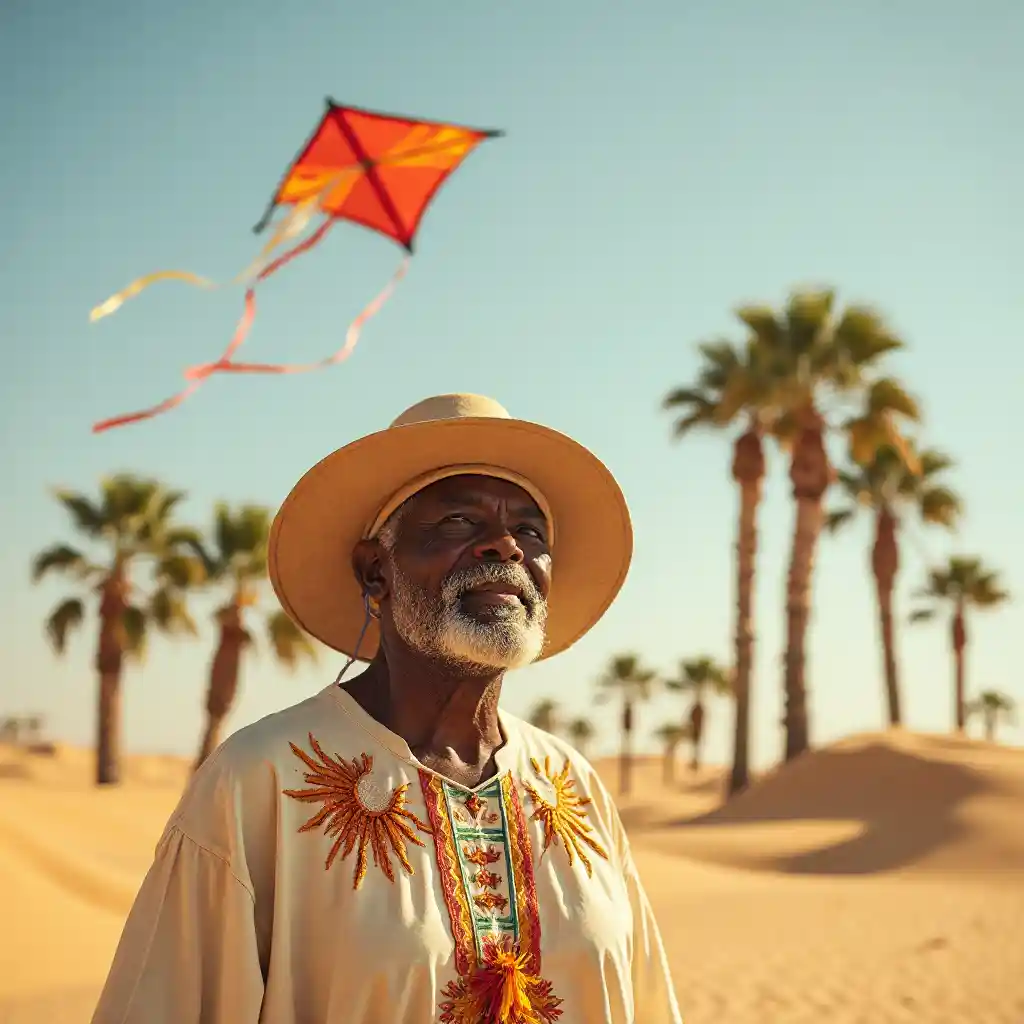 In einer Wüstenoase steigt ein Drache, der 74-jährige Schwarze trägt eine Mütze und trägt einen Sonnenstickmantel. Palmen und goldene Dünen rahmen ihn ein, seine eifrigen Schlepper versprühen Abenteuer der Freiheit und Sonnenschein in beschaulichen, exotischen Szenen. Sein Geist schwebt mit dem Drachen.