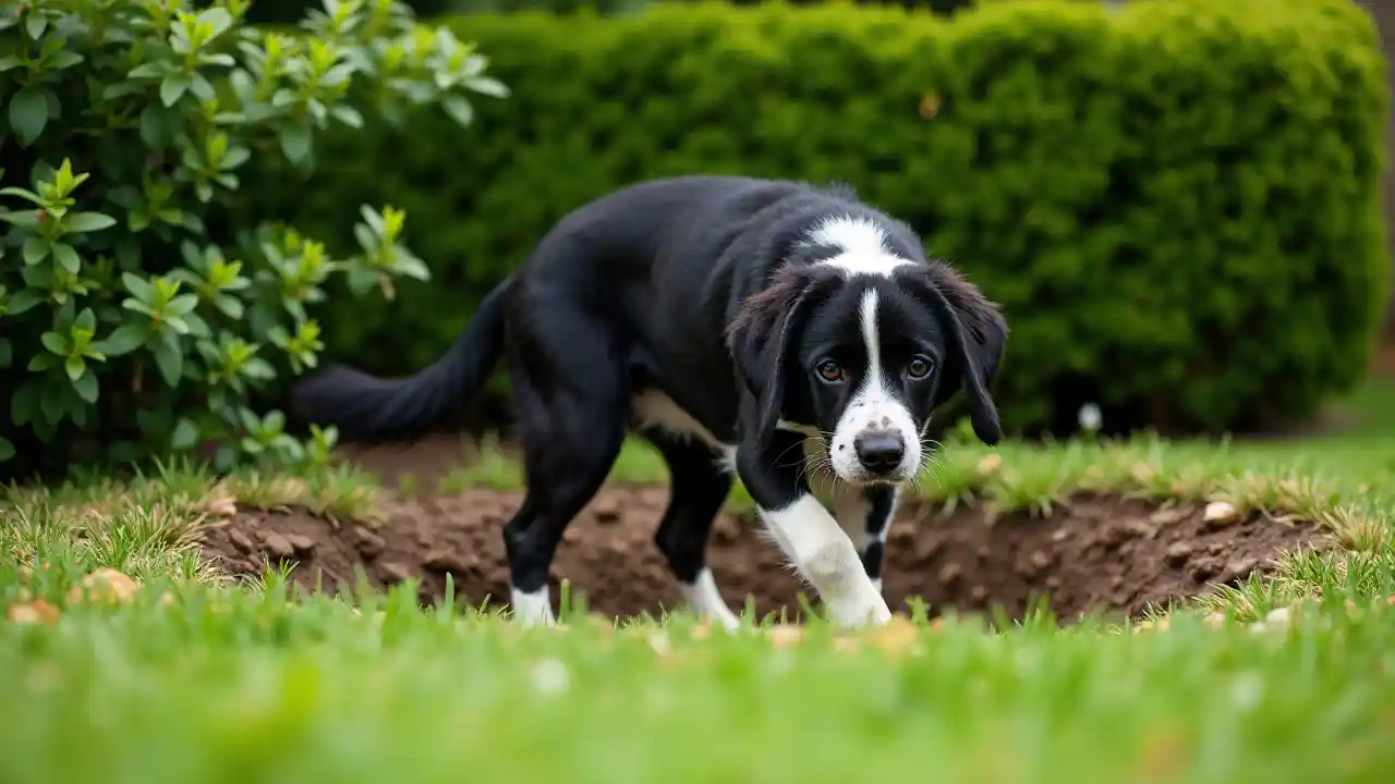 Schwarz-weißer Hund gräbt und sichert ab