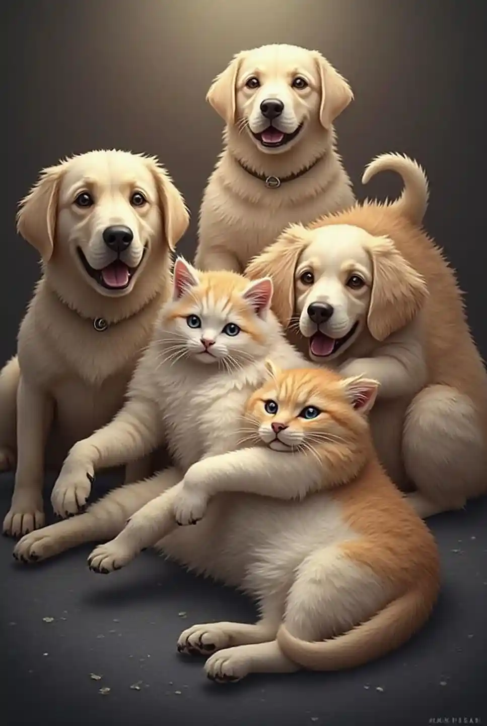 Superrealistische, hochwertige Fotos, Hunderegion, 1 riesige süße Katze liegt, Hundeherde umringt die Katze