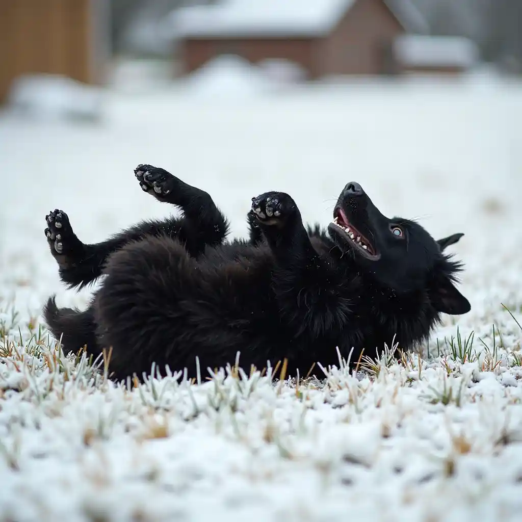 JosephDer schwarze Hund wälzt sich auf dem Rücken, die Beine hängen in der Luft und schaut glücklich auf den schneebedeckten Rasen