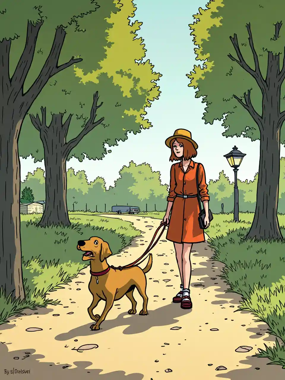 MilaEine Frau geht mit ihrem Hund im Park spazieren, 2D-Comic-Schreibtafeln, Herges Tintin-Style