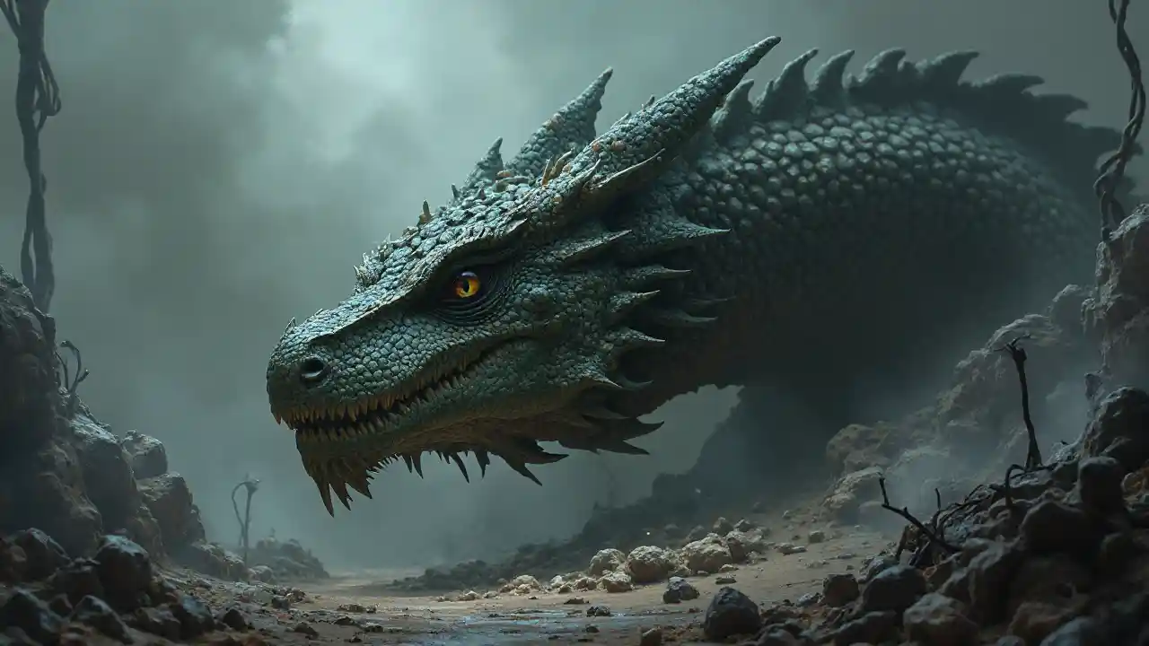 Atemberaubende Details zeigen einen imposanten Drachen, der sich nach tausend Jahren Tiefschlaf bewegt und in seinen halbgeöffneten Augen eine starke, faszinierende Kraft hält, die den Menschen berauscht. Konzeptkunst fängt die Pracht des Drachen in einer verzerrten, gesprenkelten Schuppe und einer verstörenden Form einer chaotischen, eindringlichen Atmosphäre ein. Die Szene, obwohl es an Feinschliff mangelt, ruft eine primitive, unzähmbare Ästhetik hervor, die den Betrachter in surreale, traumhafte Momente eintaucht, die über die traditionelle Schönheit hinausgehen.