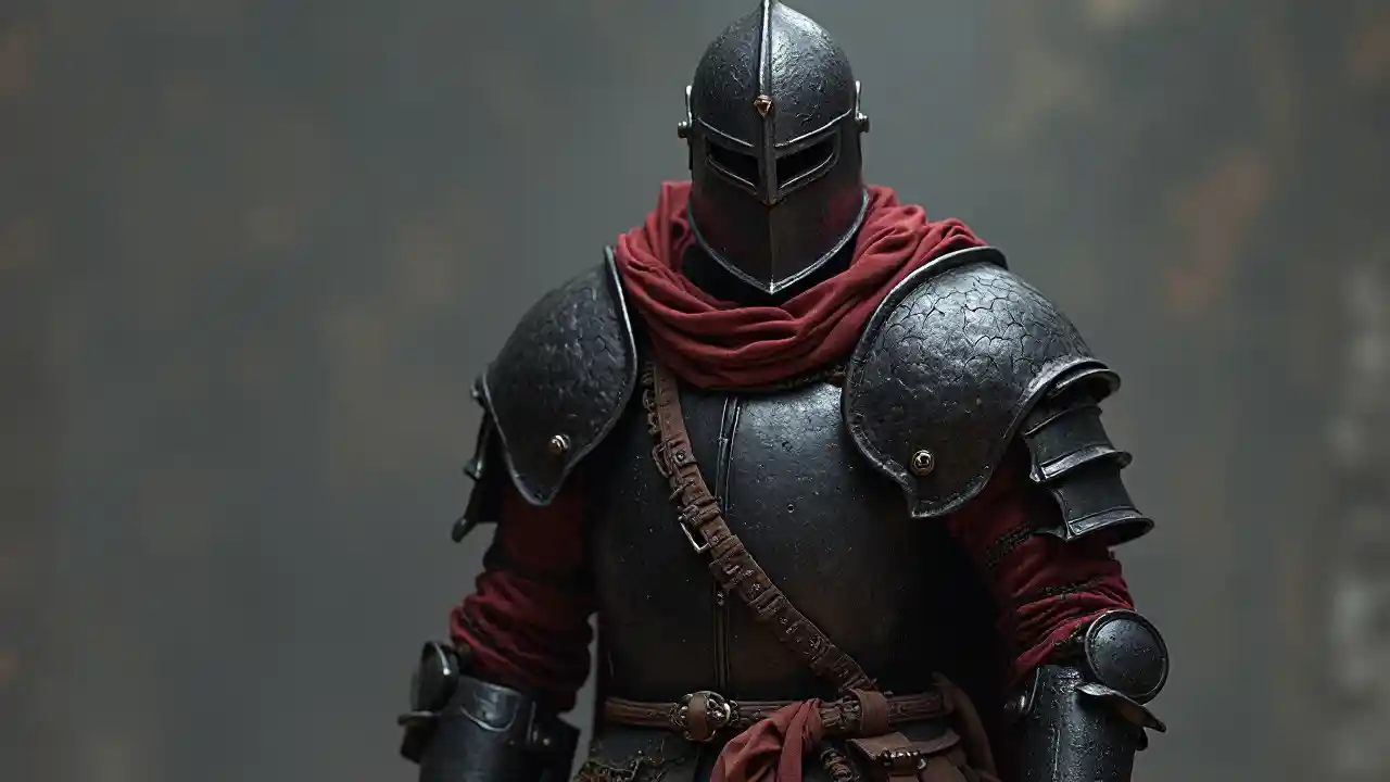 Ein Ritter in roter, besetzter Drachenschuppe und schwarzer Rüstung mit brauner Schultasche an seiner Seite