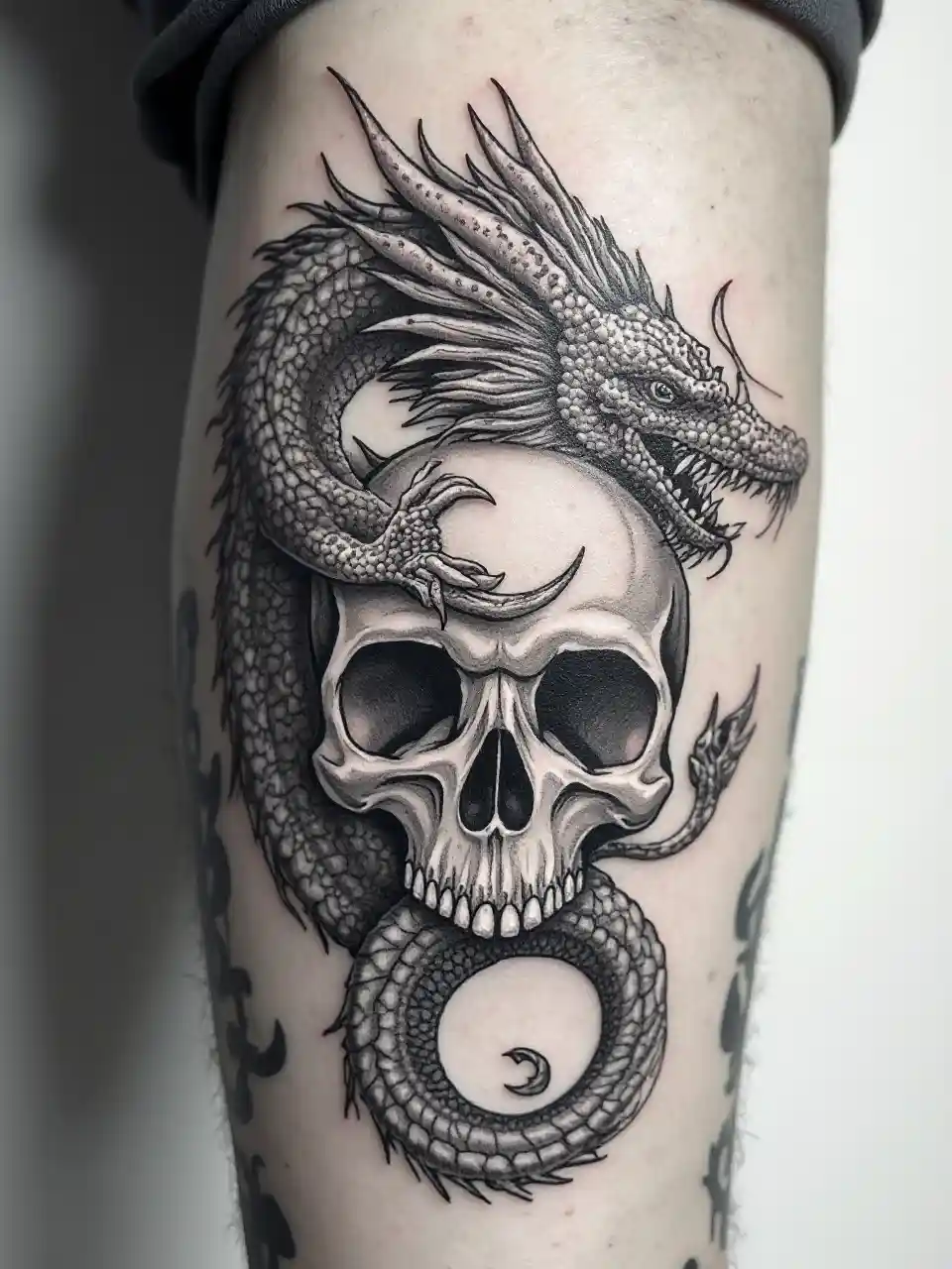 Die schwarz-weiße Tätowierung des Drachen mit dem Schädel am Arm.