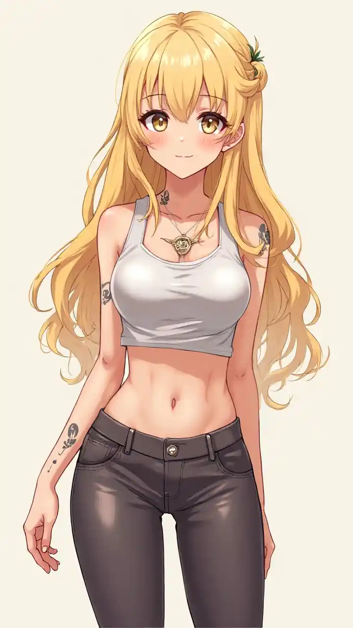 Süßes, unschuldiges, niedliches (erwachsenes) amerikanisches Gold-Comic-Girl, Leggins und bauchfreies Top., Charakterentwurfsliste. "DRBlues" -Tattoo, "DRBlues" -Tag. Wirklichkeit.
