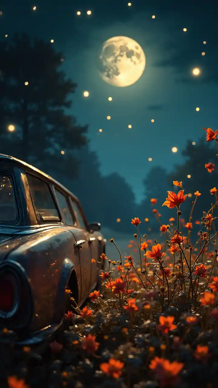 Visualisieren Sie einen (((lebendige und detaillierte Szene)), von denen einer ((im Herbst rennt, seine Blütenblätter winken sanft aus einer (((Autofenster))) Brise in der Nacht, in einem (((Vollmond)) weichen Licht und ((goldene Sterne)) über den Himmel streuen, was eine warme Nostalgie hervorruft. Die Szene erinnert an eine vergangene Zeit, in der die schlanke Silhouette des Autos und die verworrenen Details des Laufens in einer gemütlichen, verträumten Atmosphäre nahtlos miteinander verschmelzen