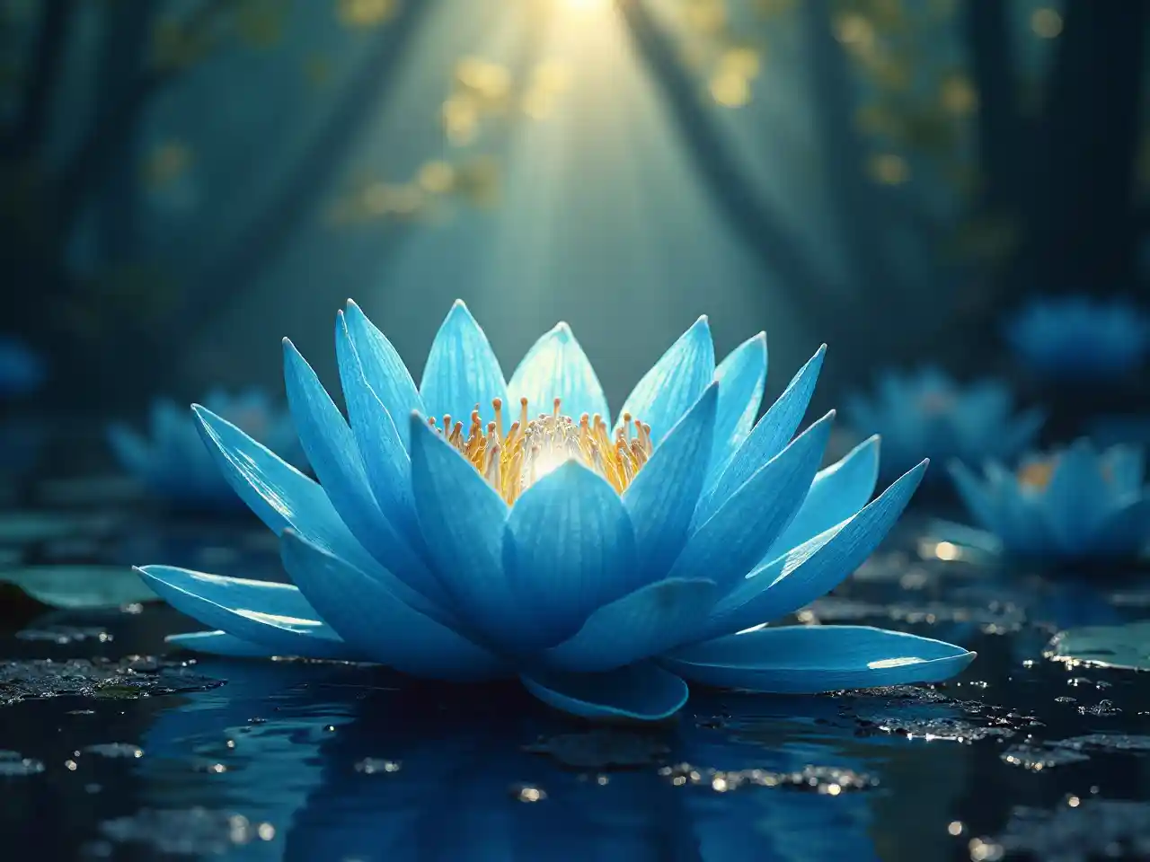 Die friedliche und geheimnisvolle ägyptische Mythologie wird in einer üppigen und lebendigen blauen Seerose dargestellt, deren zarte Blütenblätter und Blätter sich wie heilige Eingänge ausbreiten, umgeben von subtilen Hieroglyphenmustern und komplizierten Lotusblüten, die die symbolische Kraft der Wiedergeburt und des spirituellen Wachstums hervorrufen, ein schwaches goldenes Licht blickt durch die Wasseroberfläche, als ob der Sonnengott Ra die Szene beobachtete, mit alter Weisheit und Mysterium, In eine verträumte Atmosphäre transportiert, in der die Grenze zwischen Realität und Mythologie verschwimmt, lädt den Betrachter ein, in die bezaubernde Welt der ägyptischen Mythologie zu treten, Dort warten Magie und Wunder.