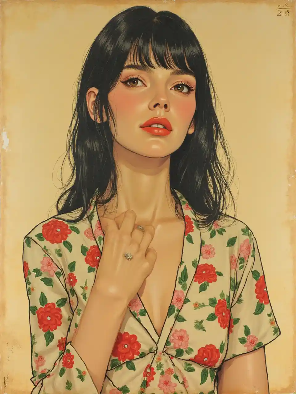 Eiza gonzález porträt by ikenaga yasunari und ayana otake and ko rakusui, 60er-Jahre-Poster, Gemälde, realistisch, fokussiert scharf, japanisch, verträumt, nostalgisch, verblassen, goldene Töne, Blumenmantel