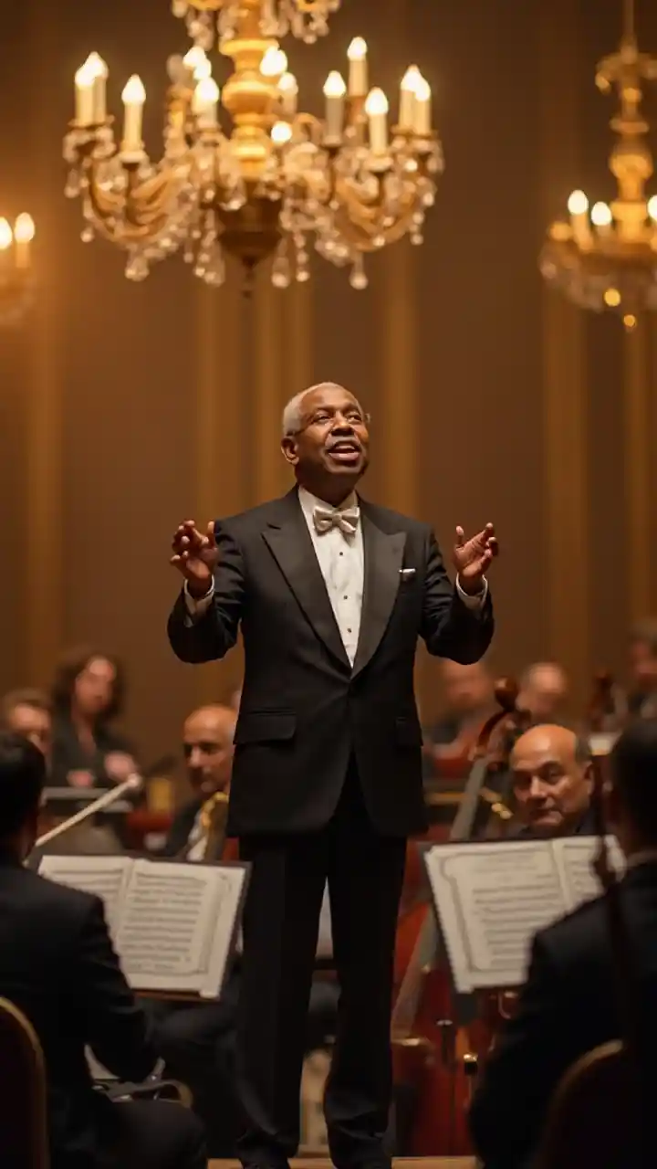 Dirigiert die Sinfonie im prunkvollen Konzertsaal, steht ein schwarzer Mittfünfziger hoch im Smoking. Kronleuchter und Musiker rahmten ihn ein, seine majestätische Geste strahlte Eleganz und Beherrschung der Musik in prächtigem, goldenem Licht aus.