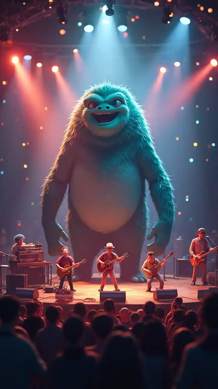 Eine lebendige, faszinierende Szene, ein riesiges Wesen, das einem sanften Riesen ähnelt, spielte fröhlich mit einer Band auf der Bühne. Die Szene strahlt die magische Essenz von Studios Ghibli, Disney und Disney-Animationen aus, abgebildet in detailreicher 3D-Umgebung, mit klaren, lebendigen Texturen, die von der Unreal Engine 5 angetrieben werden. Die Atmosphäre wird durch sanfte Blüten und dramatisches, immersives Licht erleuchtet, das dynamische Schatten auf die Bühne wirft. Das Wesen und seine Bandmitglieder stecken voller Ausdruckskraft, die an Greg Rutkowskis klassische Schlüsselkunst der Animation erinnert. Das Publikum ist im Hintergrund sichtbar, fasziniert, jubelt und sorgt für eine warme und lebendige Atmosphäre. Die Szene fing die Freundschaft und Freude der Musik, die bunten Noten und skurrilen Musikinstrumente und andere kleine kreative Berührungen ein, die die fantastische und bewegende Ästhetik ergänzten.