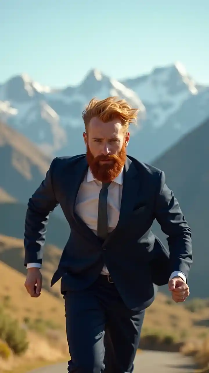 Der Kaukasische Mann mit hellroten Haaren und Vollbart, im dunkelblauen Anzug, läuft bei klarem Himmel kräftig über die Landschaft in Richtung Berge → macht die Haare weniger rot, weniger buschig → macht die Haare glatter und der Bart viel kleiner
