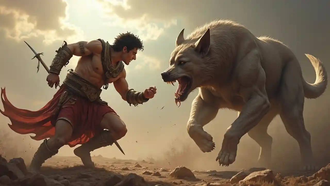 Der epische Kampf zwischen dem männlichen Athena-Krieger und dem riesigen Teufelshund