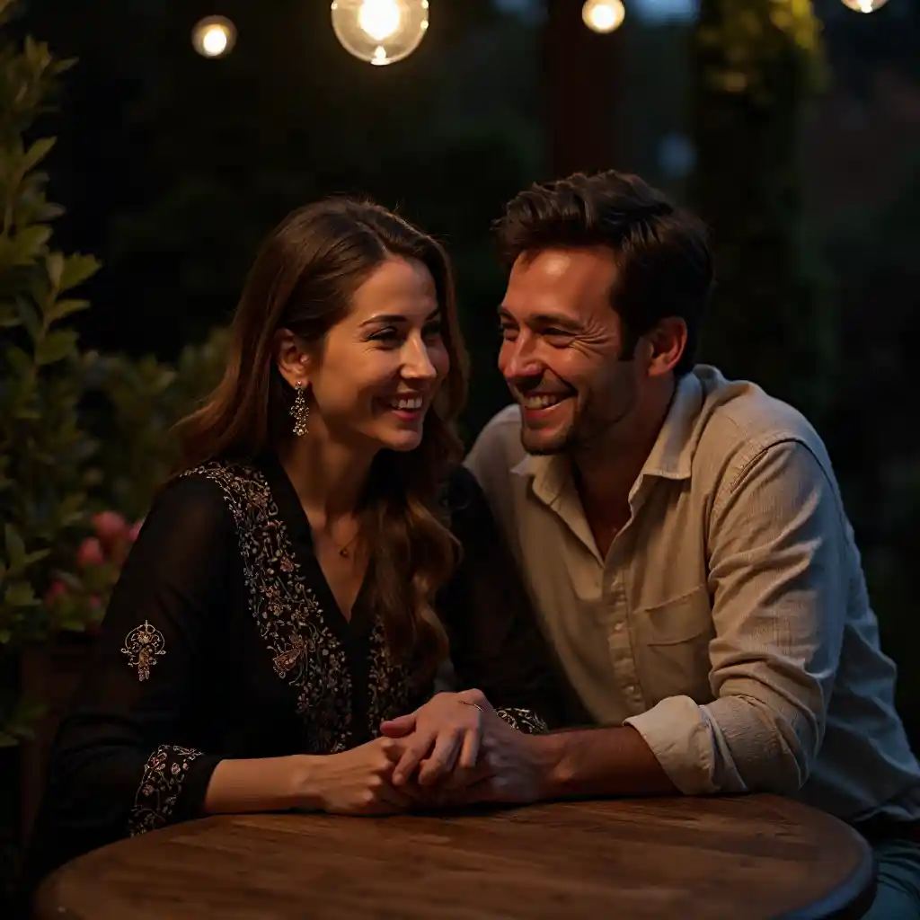 Im sanften Licht des atmosphärischen Lichts teilten sich die beiden Personen einen Moment auf einem Rundholztisch in einer Outdoor-Umgebung, was auf eine gemütliche Abendatmosphäre hindeutet. Die Frau war in einem dunklen, aufwendig gestalteten Outfit gekleidet und strahlte ein ruhiges Selbstbewusstsein aus, ihre Haare fielen sanft auf die Schultern. An ihrer Seite trägt ein Mann ein helles, gemustertes Hemd mit einem strahlenden Lächeln und einem Gefühl von Wärme und Kameradschaft. Der dunkle Hintergrund deutet darauf hin, dass die Nacht hereinbricht, Schatten subtil um sie herum tanzen und gleichzeitig ein Hauch von Grün zu sehen ist, der ihrer Ansammlung einen natürlichen Charme verleiht. Die Stimmung insgesamt ist angenehm und entspannt und fängt Fragmente des Lebens ein, die von Freunden oder Familie geteilt werden.