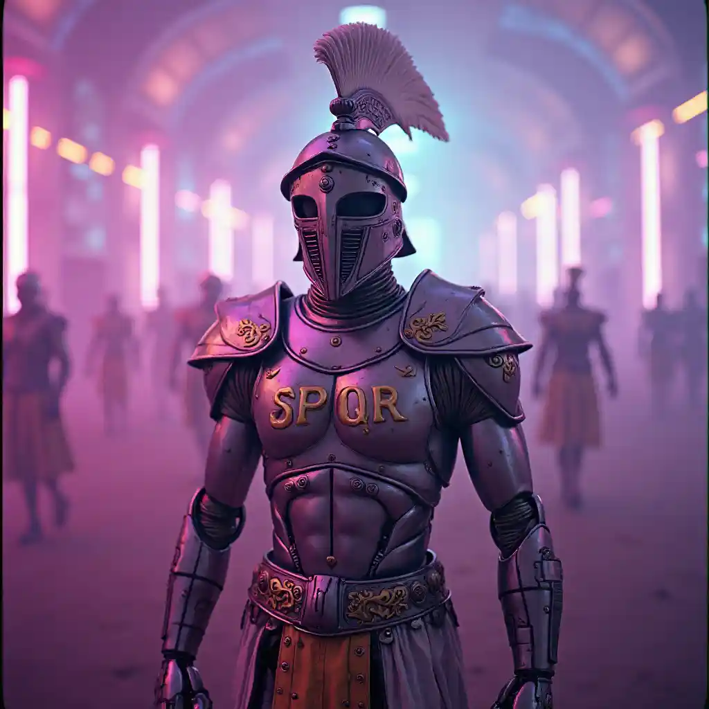 Ein hyperdetailreicher 35-mm-Film – der noch immer einen alten gesichtslosen Roboter, den römischen Praetorian, festhält, der in futuristischer Umgebung voller leuchtender Farben in Lila, Weiß und Gold steht. Die Atmosphäre füllt sich mit einer glatten metallischen Atmosphäre, verstärkt durch blinkende Neonlichter, die sich von verchromten Oberflächen reflektieren. Der Soldat schreitet mit großen Schritten über das Schlachtfeld l, sein Helm ist mit prächtigen Drucken geschmückt, die im stimmungsvollen Licht glitzern. Die komplexen goldenen Buchstaben buchstabieren "SPQR", was die reiche Textur seiner Robotereigenschaften kontrastiert, ohne Mimik, aber Kraft und Geheimnis ausstrahlt. Die subtilen Partikel verleihen der nostalgischen Filmqualität eine Mischung aus Antike und Futurismus, wie ein weltfremder Nebel, der in die Szene webt und die dramatische Atmosphäre unterstreicht.