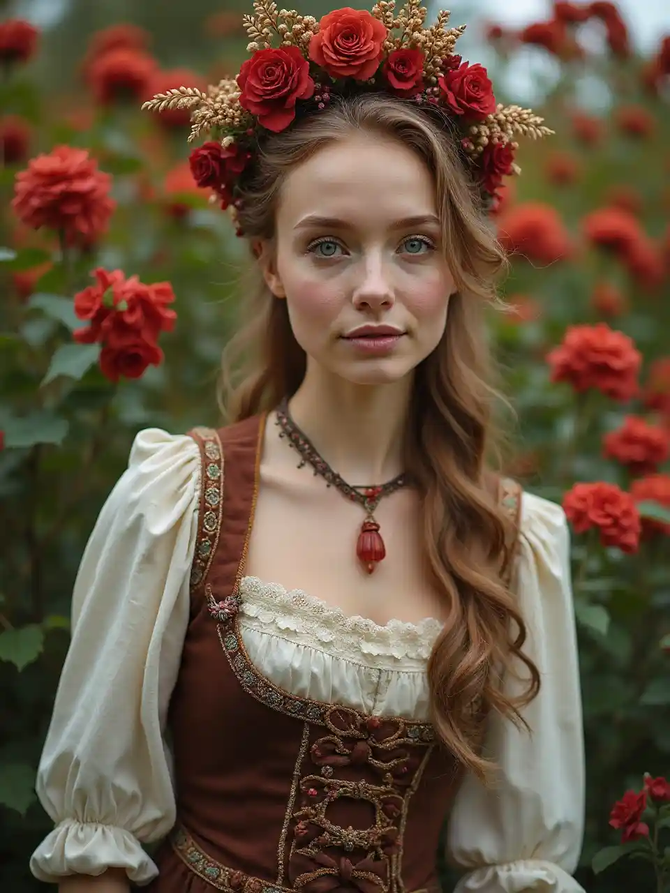 SkylarEine schöne Frau in einem russischen Märchen umringt ein Bündel von Rowens Porträts in traditioneller Tracht