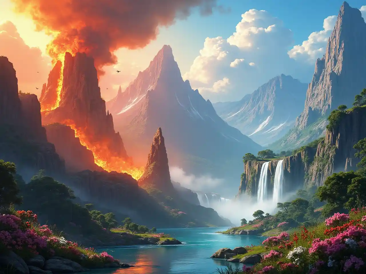 Diese atemberaubende Fantasy-Landschaft-Tapete stellt einen dramatischen Kontrast zwischen feuriger Zerstörung und beschaulicher Naturschönheit dar. Auf der linken Seite werden die hoch aufragenden Gesteinsformationen von lebendigen orangefarbenen und roten Flammen und dichtem Rauch verschluckt, was auf einen Vulkanausbruch oder ein katastrophales Ereignis hindeutet. Über dieser Hölle fliegen die Vögel in den leuchtenden Himmel. Im Gegensatz dazu bildet die rechte Bildseite ein beschauliches Tal ab. Die majestätischen, zackigen Gipfel sind in Nebel gehüllt, dem hellen, nebligen und gesprenkelten Himmel zugewandt. Ein klarer, kaskadierender Fluss fließt das Tal hinab und bildet mehrere Wasserfälle, die darunter zu Wasserbecken rollen. Das Ufer dieses Flusses ist mit üppigem Grün und bunten Blumen in Rosa, Rot, Weiß und anderen Farben übersät und erzeugt ein lebendiges und neues Gefühl. Der Gesamteffekt ist eine optisch auffällige Darstellung der gegnerischen Kräfte, die in der Illusion nebeneinander existieren.