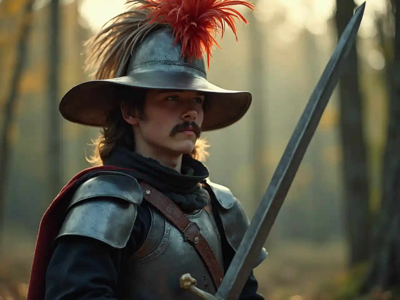 Hohe Auflösung, hohe Qualität, hohe Details, sanfte Beleuchtung, Kinobeleuchtung, realistisch, Spiegelreflex, Bokeeping, Studioqualität, Schattenpartikel, Panorama, Filmaufnahme Ein junger Landsknecht trägt einen großen Hut mit bunten Federn und Federn, Rüstung, schwarzes Hemd, Schnauzer, ein langes Schwert in der Hand, stehend, schlichter Hintergrund, Fantasy-Filme der 80er Jahre