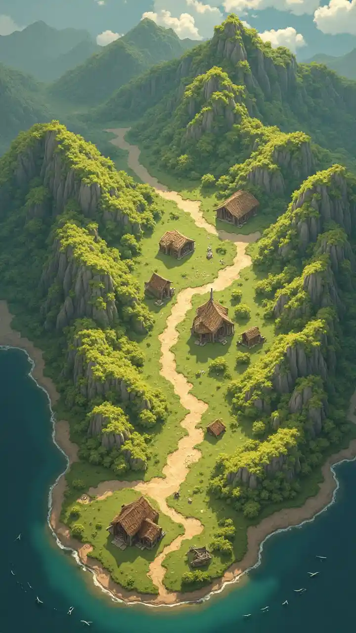 Eine Karte des Gebiets mit kleinen Hütten und Siedlungen, einige Bäume, hügeliges Gelände, Fantasy-Kunst, ultradetaillierte Fantasie, kein Text