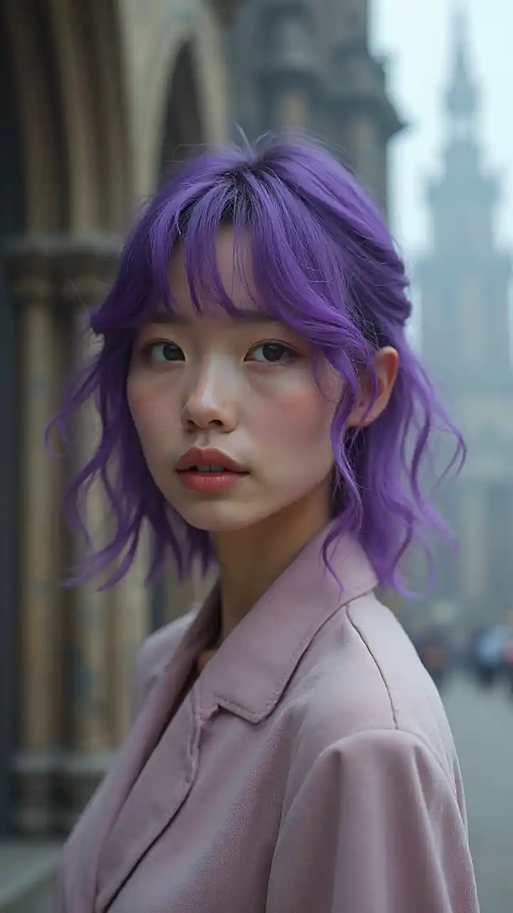 Schöne Porträts asiatischer Modemodels, energiegeladenes lila Haar, ätherischer Traumnebel, Fotos von Anne Leibovitz, Fotos von redaktionellen Modemagazinen, stilvolle Posen vor dem gotischen Domgebäude. Zeitschrift Kinfolk. Filmpartikel. Sanftes Lächeln