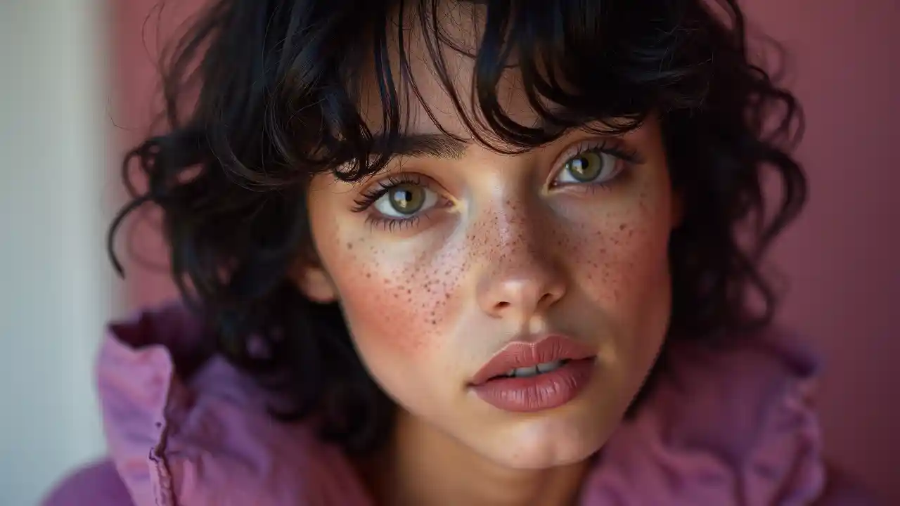 Frau mit schwarzen Haaren und Sommersprossen in Pink und Lila